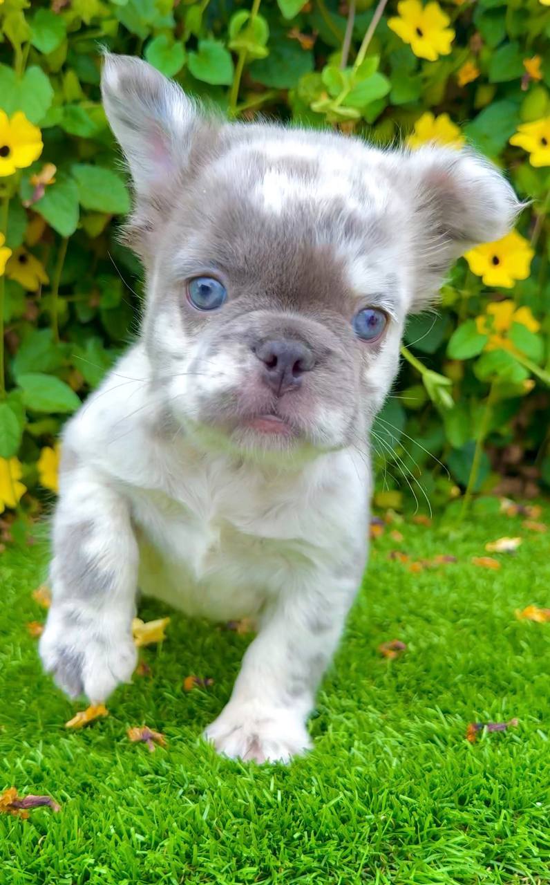 Trixie is an 8-week-old Fluffy Blue Merle French Bulldog female available now in San Diego. Her merle coat, long fluffy hair, and bright blue eyes make her one of the more visually striking Frenchies we’ve produced. She’s built well for her age and ready to go to her new home.